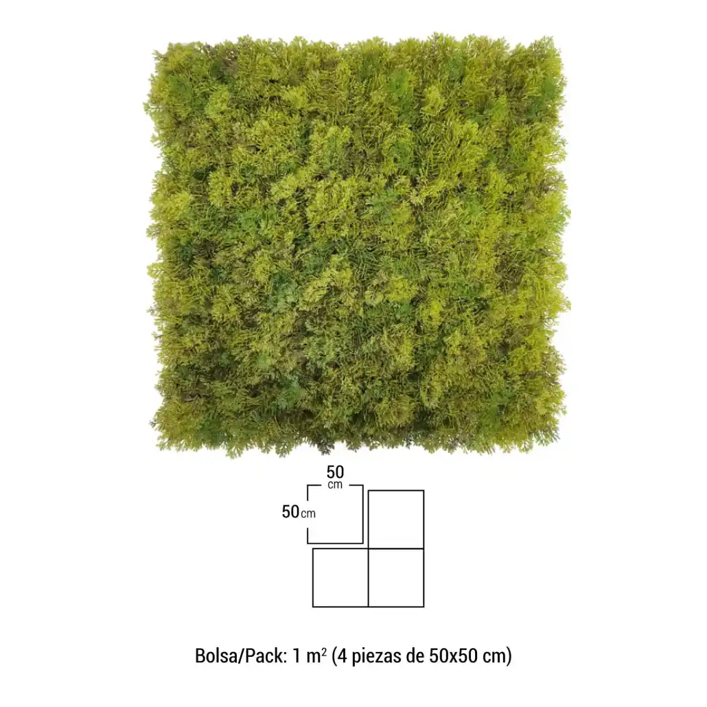 - Composición vegetal: Musgo artificial de alta densidad en tonos verdes naturales